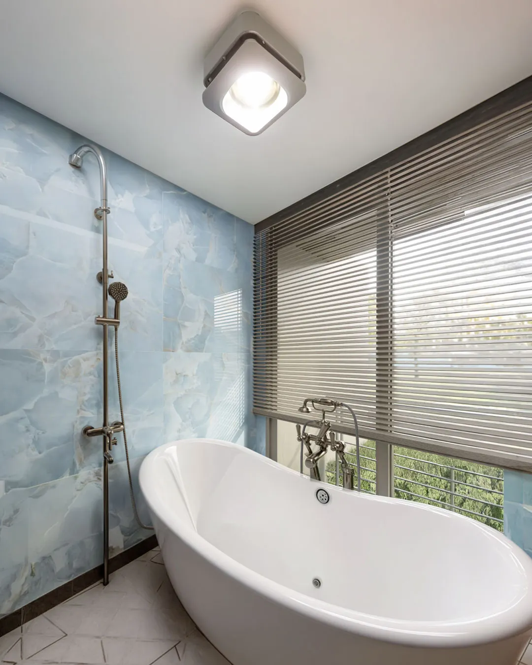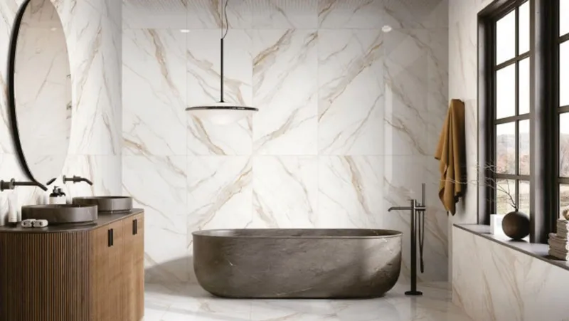 Estilo Sugerido: Acabados tipo mármol (Carrara o Statuario) para un ambiente tipo spa.